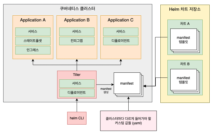 헬름은 명령행 도구인 클라이언트(cli)와 클러스터에 설치되어 클라이언트의 명령을 실행하는 서버(틸러, Tiller)로 구성되어있습니다.