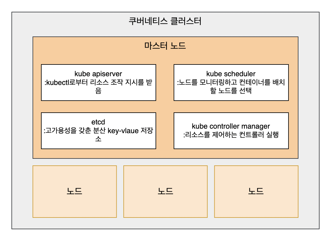 클러스터 안에는 클러스터 전체를 관리하는 역할을 맡는 마스터 노드가 반드시 하나 이상 있어야 합니다.