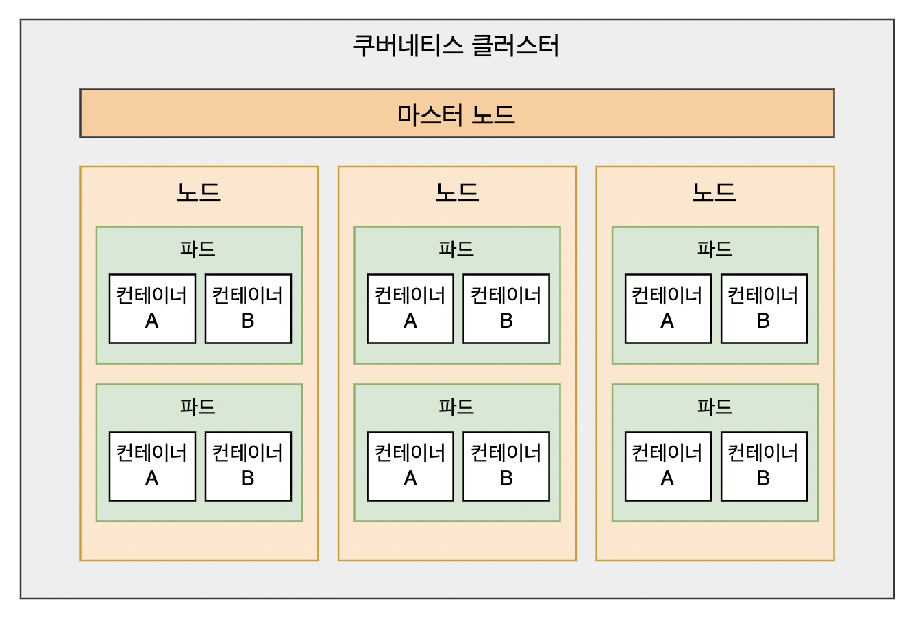 노드 안에는 필요한 컨테이너들이 배치될수 있으며, 리소스나 운영 상황에 따라 노드에 배치된 컨테이너 개수가 서로 다를 수 있습니다.