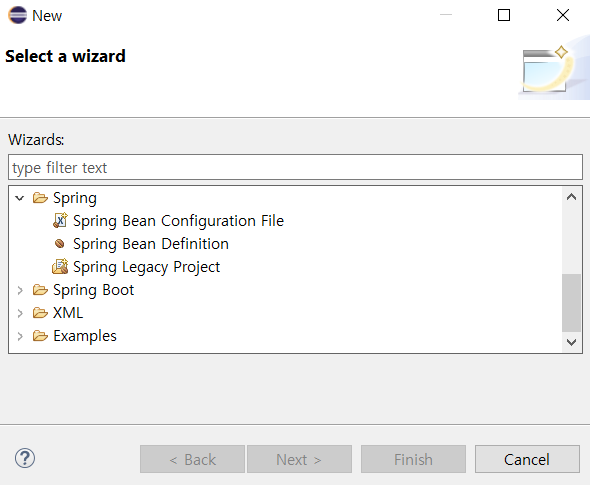 Spring Bean Configuration File을 선택하고, file 이름을 setting.xml로 만들어줍니다.