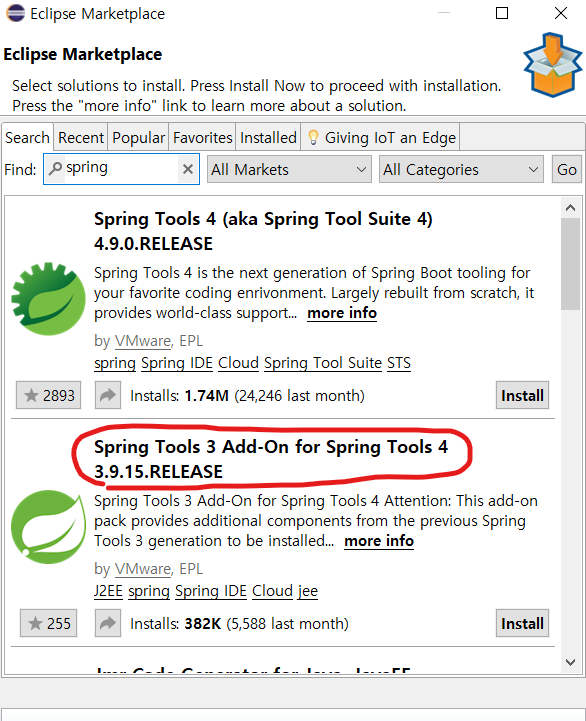 위와 같이 창이 떴다면, spring을 검색하고, 해당 플러그인을 선택하여 Install 해줍니다.