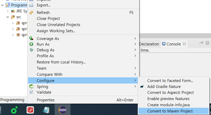 프로젝트를 우클릭하여 다음 경로에서 Convert to Maven Project를 선택해주세요.