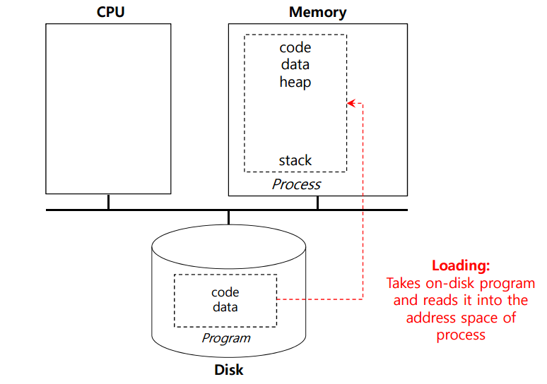 디스크에서 프로그램의 코드를 가져와 프로세스의 address space에 넣어주는 단계입니다. 프로그램은 항상 디스크에서 실행 가능한 형식으로 저장되어있습니다.