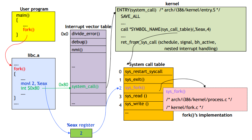즉, system_call()을 호출하여 kernel mode의 system_call 부분으로 들어갈 수 있도록 하는 것이죠.