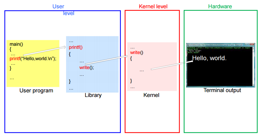 우선 User program에 있는 write(), printf() 등을 통해서, glibc와 같은 라이브러리의 해당 system call을 호출하게 됩니다.