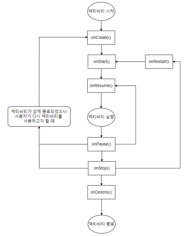 '액티비티'라는 것이 화면에 보이기 위해서 객체가 만들어지고, 기본적인 작업을 하고, 화면에 보이게 하는 등의 역할을 하는 메소드들이 있습니다.