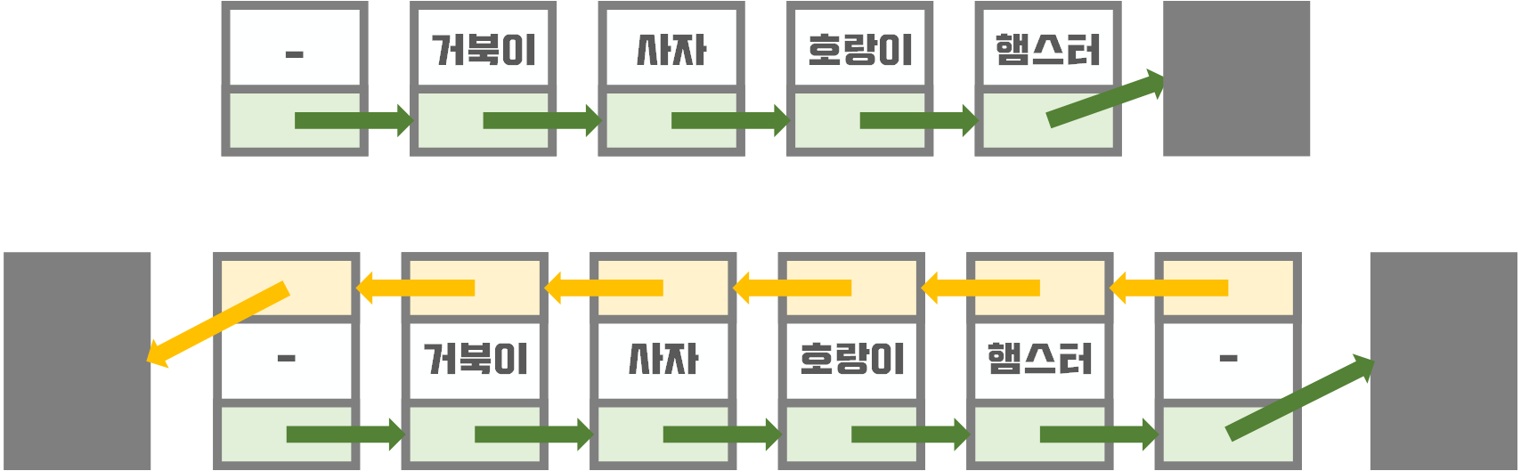 그리고 새로 삽입된 '하마' data가 있는 node는 다음 node로 호랑이를 가리킵니다.