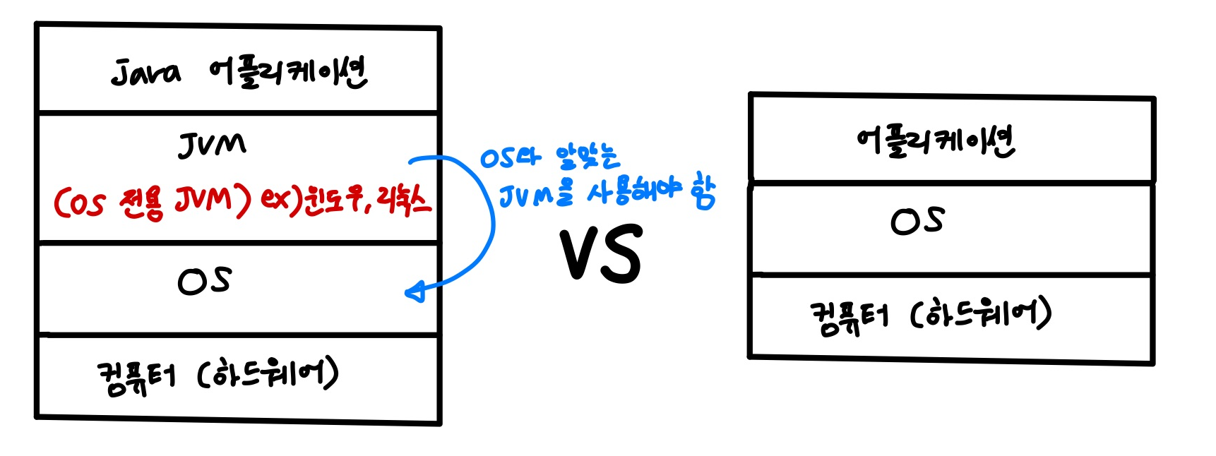 JVM은 OS 종속적으로 OS 운영체제에 따라 알맞은 JVM을 사용해야 함 (리눅스용 JVM, 윈도우 JVM...)