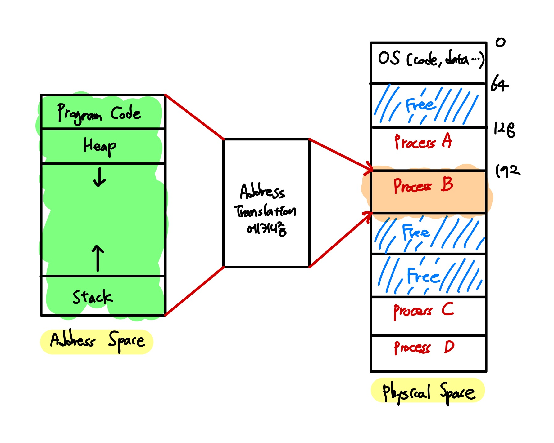 만약 address space를 위의 그림처럼 통채로 physical space에 적재하면 free space만큼 메모리 공간이 낭비되게 됨