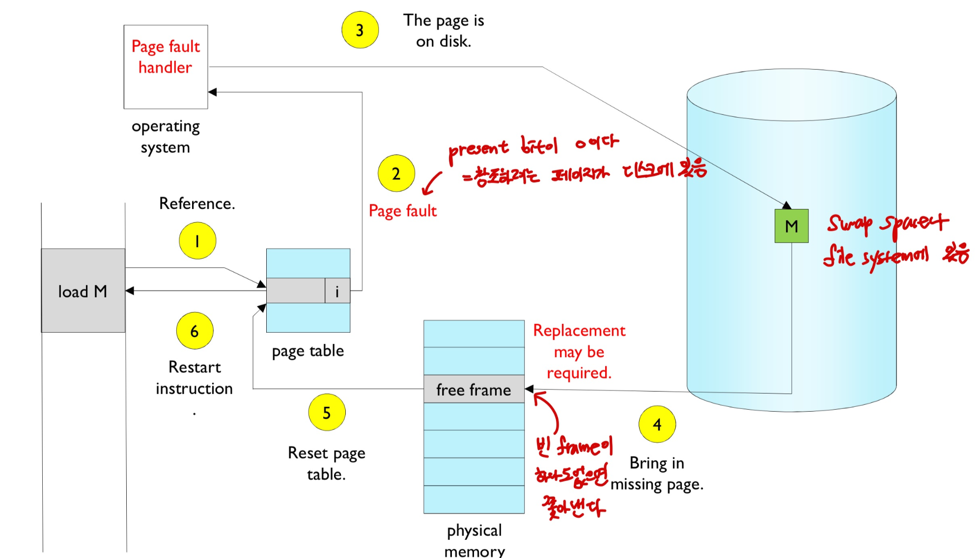 Page fault: 찾고자 하는 페이지가 memory에 없는 것. disk에서 페이지를 찾아야 함