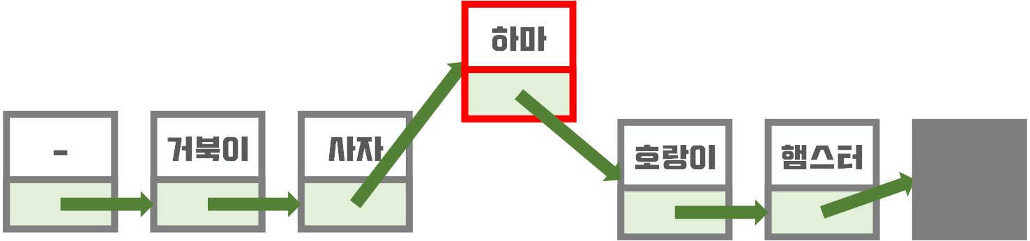 그리고 새로 삽입된 '하마' data가 있는 node는 다음 node로 호랑이를 가리킵니다.